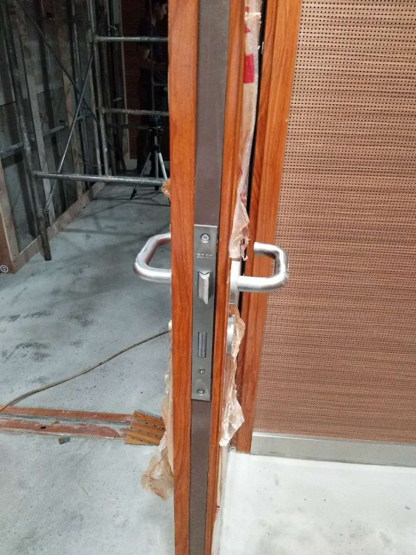 (5) 鋼筋砼門框的隔聲門扇裝入門框裁口內時,應先將扇與框附近縫隙調整好,使門扇平直。 上下門軸有必要在同一垂線上,與門框預埋鐵焊牢時,應校對方位, 避免位移變形。上下插銷及門閂,拉手的裝置方位應準確,經試裝后再行焊牢 。裝置結束后應作屢次開關實驗,查看合格后再做門框粉刷和五金零件涂防火漆。