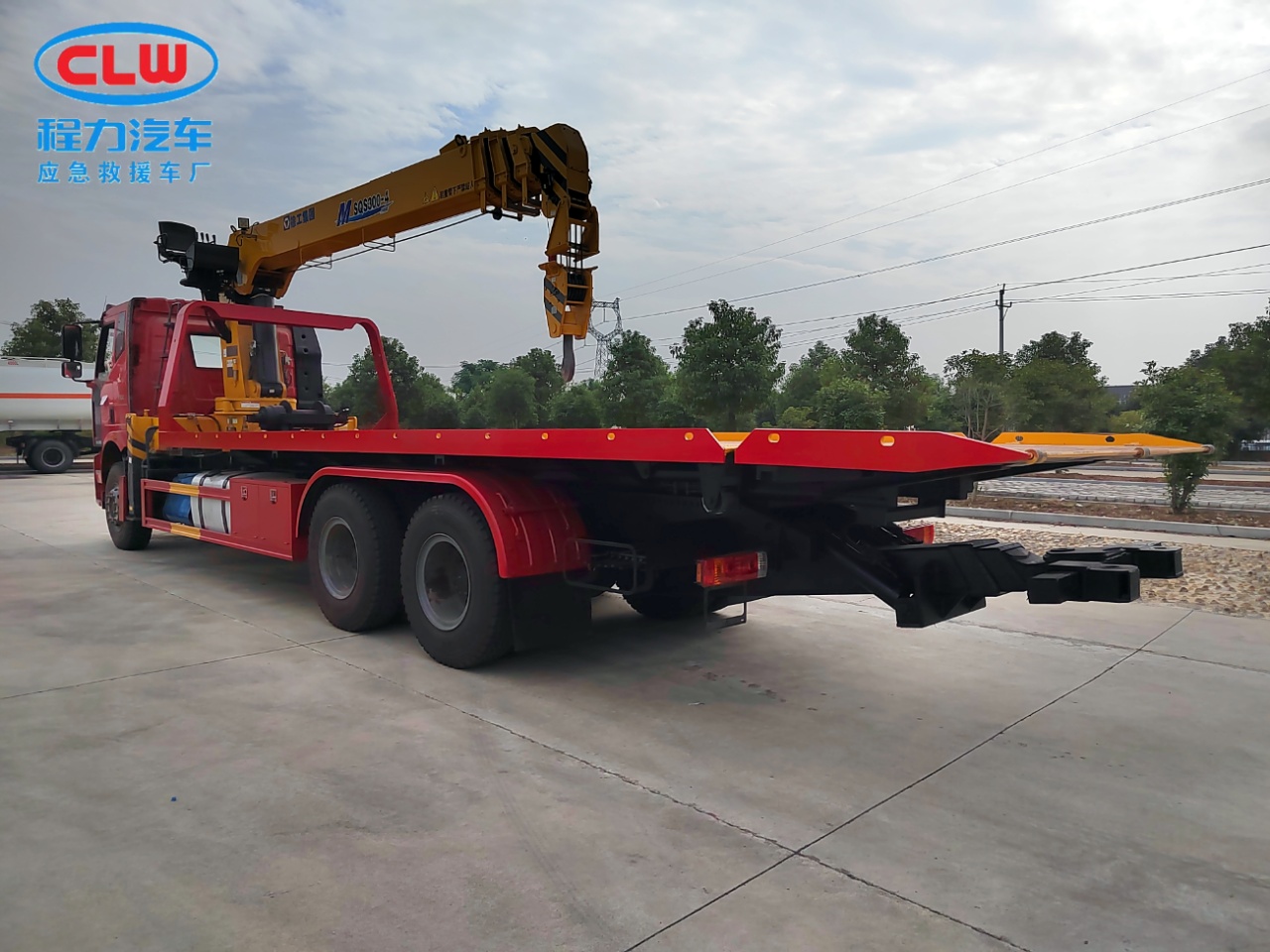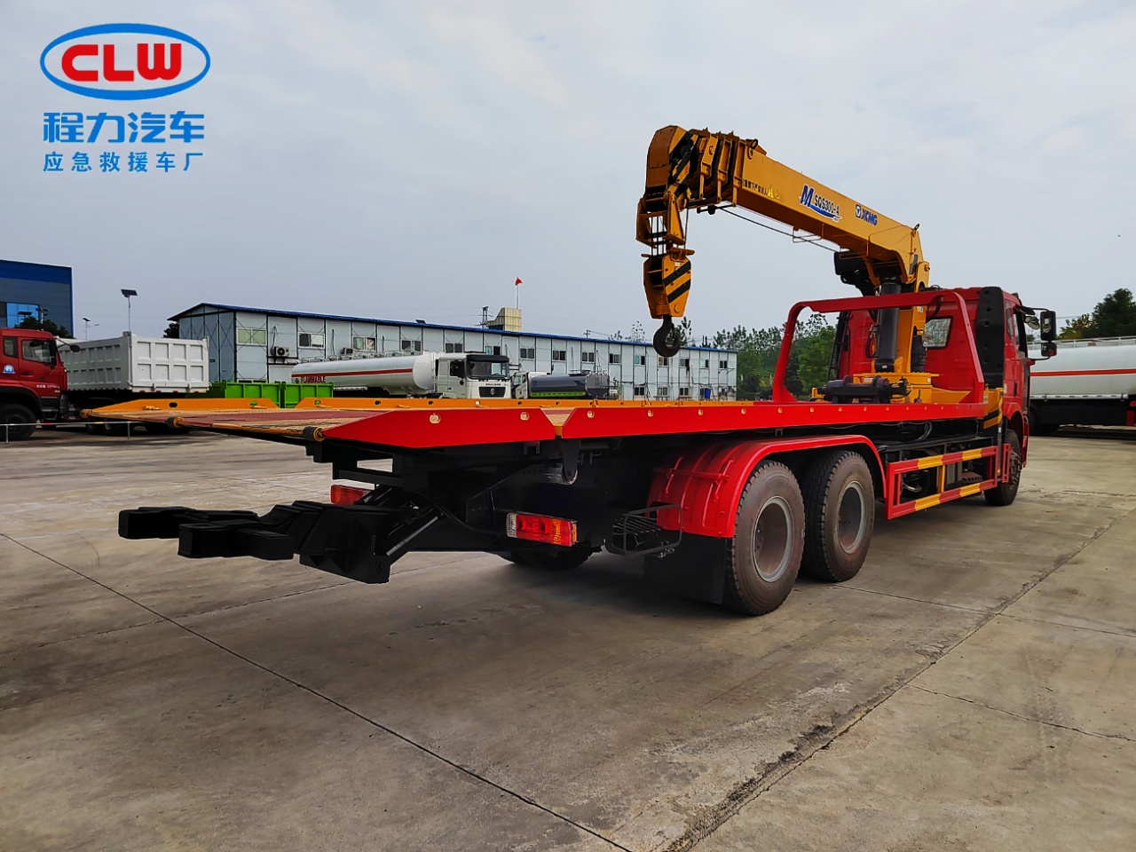 一拖二上裝配置:雙側聯動操作裝置,花紋板,雙油缸,13噸平板,13噸3節后拖臂,10噸絞盤(35米鋼絲繩),4根綁帶,L型抱胎架一對,抱胎筒一對,小車1對,3對拖叉,1對鋼板吊耳拖叉,1對拖叉座。板長9米,寬2.55米